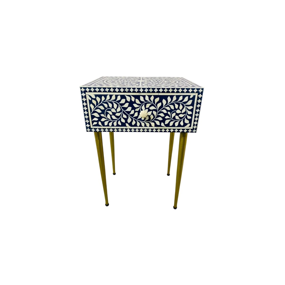 Navy Blue & White Bone Inlay Single-Drawer Accent Table with Gold Legs