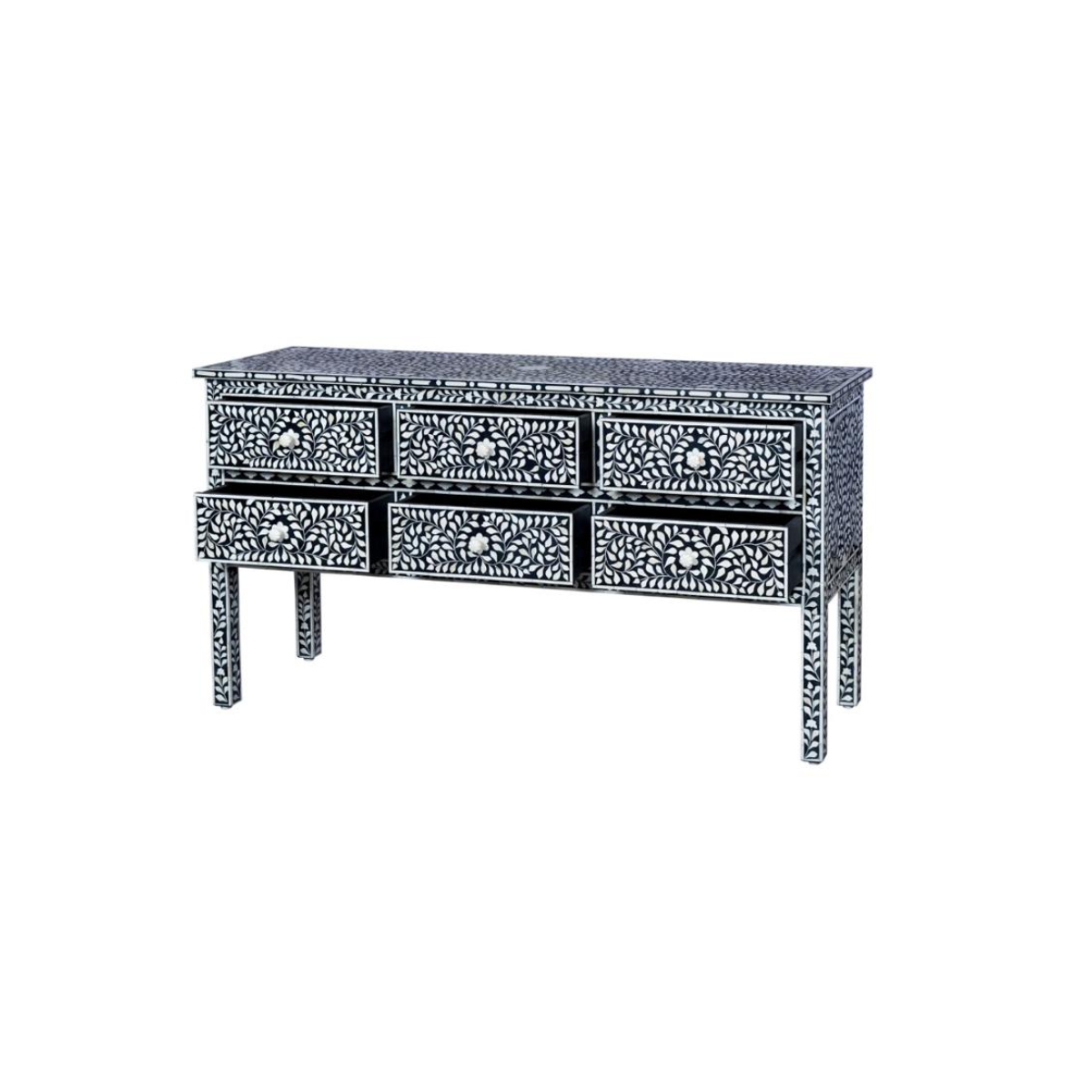 Wide Black Floral WOODEN BONE CABINET 6 DRAWER