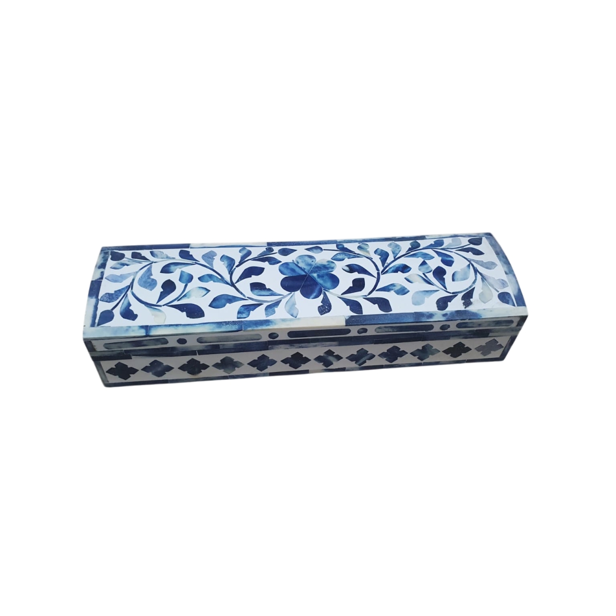 Long Blue Floral Bone Inlay Box with Arched Lid