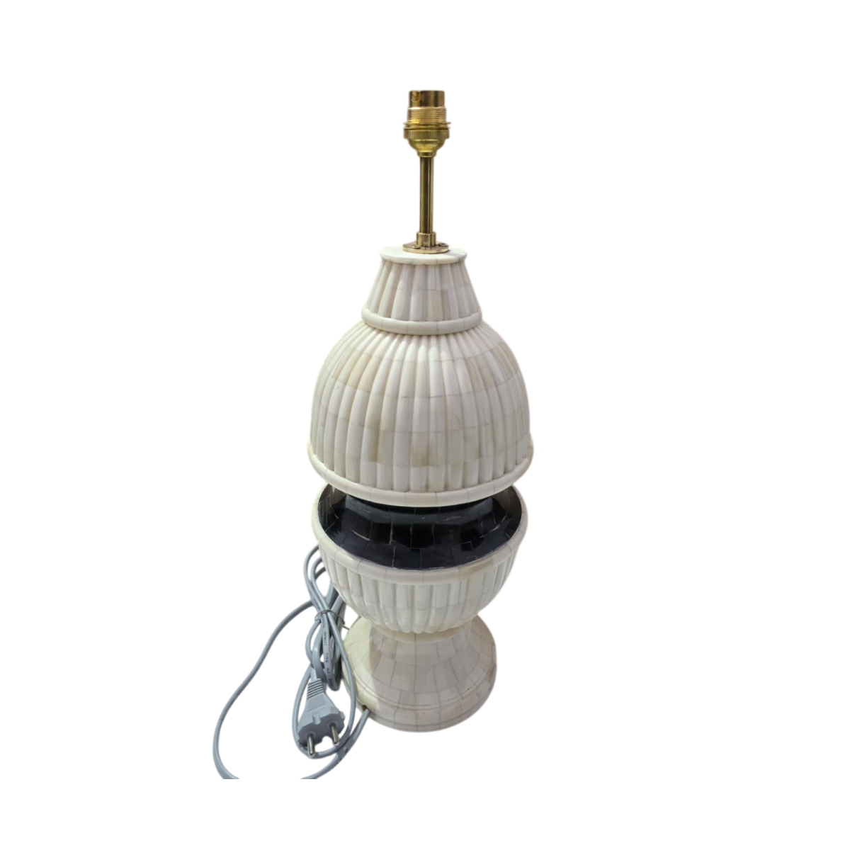 A large and architecturally inspired table lamp base constructed from bone inlay in a classic urn or jar silhouette. This design features distinct upper and lower ribbed sections in natural white bone inlay, separated by a contrasting central band in a dark, possibly black, material. The ridged texture on the bone sections adds definition and a classical touch. The substantial size and two-tone color contrast make this a commanding decorative piece. Finished with a standard light socket, this lamp is ideal for adding dramatic lighting to a large console or side table.