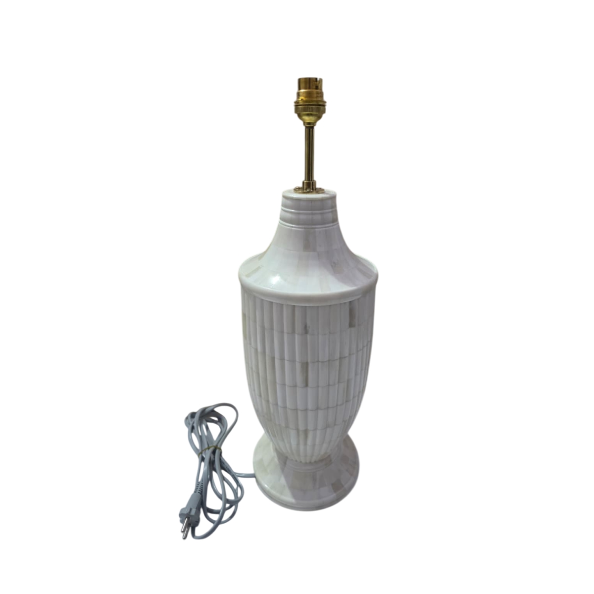 This elegantly shaped table lamp base features a smooth, tapered, vase-like silhouette. The body is entirely covered in vertical bone inlay strips, creating a subtle, appealing ribbed texture that emphasizes the curve of the lamp. The natural ivory and beige tones of the bone pieces offer a warm, neutral glow when lit. The design transitions smoothly from the wide lower body to the narrow neck, resting on a simple round base. This piece is a sophisticated and timeless choice, adding texture and handcrafted beauty to modern and traditional settings alike.