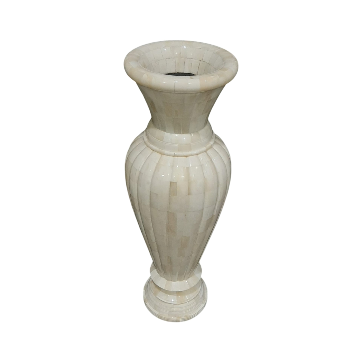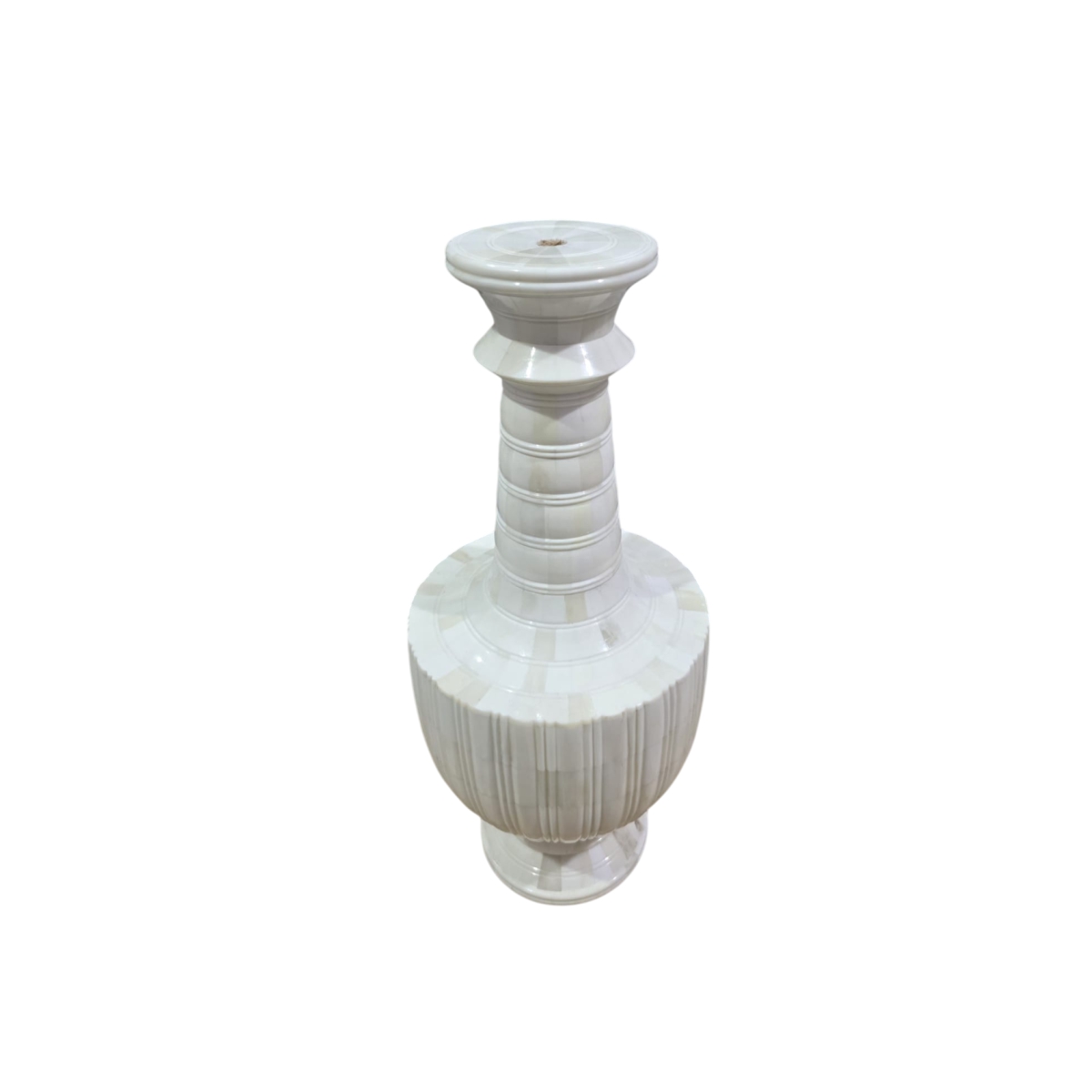 This is an exquisite Tall, Slender Fluted Bone Inlay Vase, characterized by its graceful height and tapered form. The overall shape is an elegant, inverted-cone silhouette, standing proudly on a tiered, prominent circular base. The entire surface is covered in meticulously crafted vertical bone inlay strips that are subtly fluted, giving the piece a consistent and sophisticated ribbed texture from base to flared mouth.