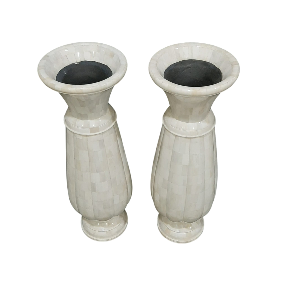This is a stately pair of tall, matching vases, characterized by a slender, tapering body and a dramatically flared, trumpet-style neck. The surface is adorned entirely with off-white bone inlay pieces, which are arranged to form gentle vertical fluting or ribbing on the lower section of the body, providing a sense of verticality and texture. A subtle ring or band separates the neck from the body.