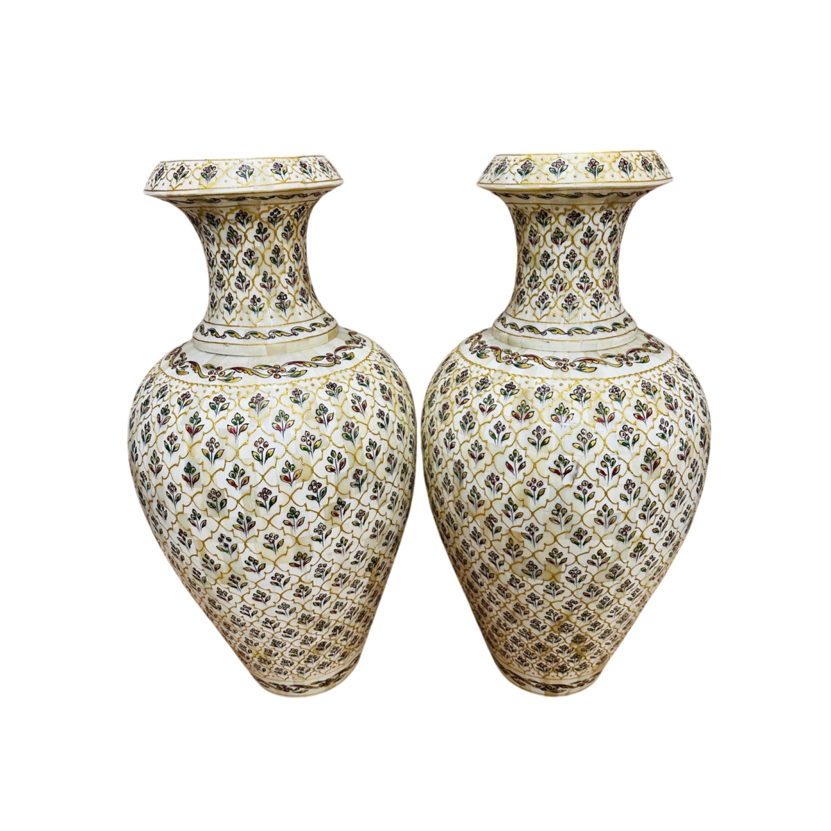A stunning pair of cylindrical cases, likely used for holding scrolls (patras). These pieces feature exceptional Mughal or Rajasthani miniature style paintings in the center panel, depicting a courtly scene of a couple in traditional attire (yellow and pink/red garments) set against a green background and framed by delicate vine motifs. The rest of the surface is adorned with simple repeating leaf patterns on a cream base.