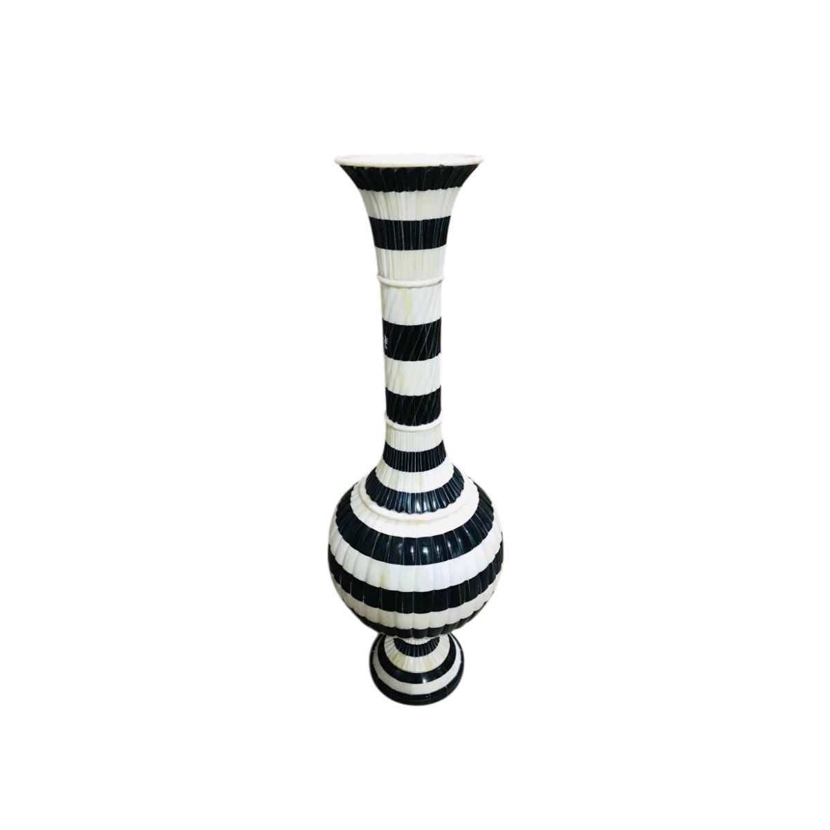 This is a particularly tall and graceful vase defined by its dramatic silhouette: a wide, flared lip transitions into an extremely long, slender neck before widening into a substantial, rounded lower body. The entire piece is adorned with alternating black and white horizontal stripes achieved through the bone inlay technique. The proportions emphasize height and elegance, making it an ideal floor vase or a centerpiece on a tall pedestal.