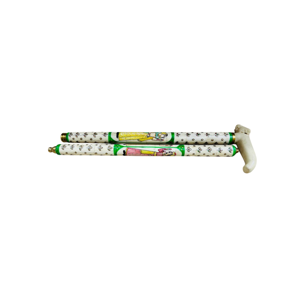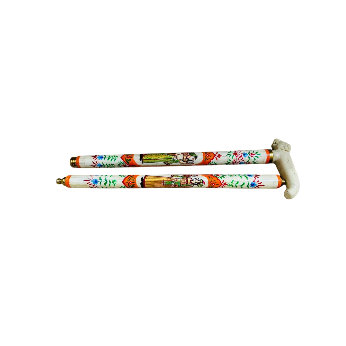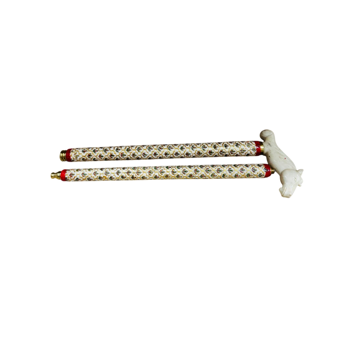 This item is a beautiful example of a traditional, two-piece stick. The cylindrical body is meticulously covered with a vibrant floral and geometric pattern painted on a white background, featuring accents of gold, red, and green enamel. The casing is capped at one end with a contrasting red/brass band, while the other end features a charming, hand-carved animal figure (possibly a dog or small mammal) that serves as the handle or finial.