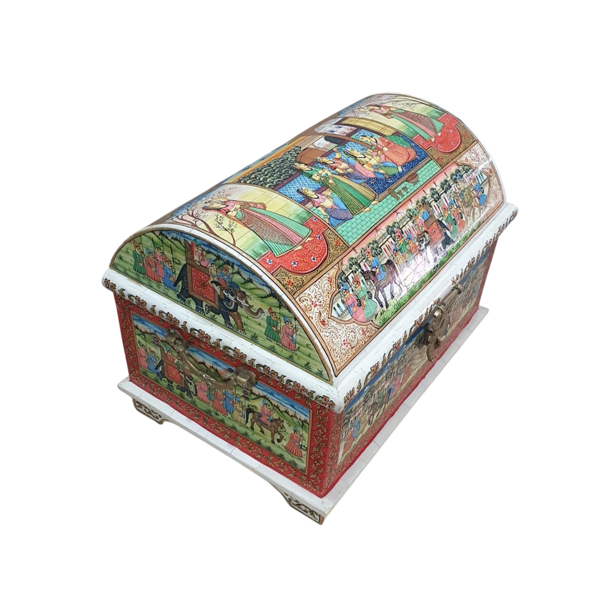 This is an exceptional, medium-sized storage chest featuring a distinctive domed, curved lid and a flat base. The entire surface of the box—the lid, front, and sides—is meticulously covered with hand-painted miniature scenes depicting royal life, processions, landscapes, and possibly mythological events, framed by delicate floral borders. The artistry is rich in detail and color, a hallmark of traditional Indian painting styles. The box is accented with brass hinges and a clasp, providing a functional yet luxurious place for storing valuables or keepsakes. The rounded lid gives this chest a unique, antique appeal.