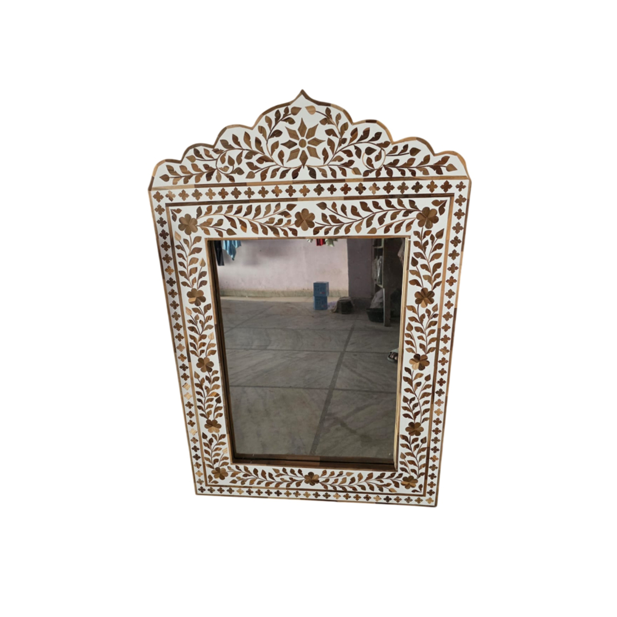 This regal mirror features a classic Mughal-style arch crest at the top, giving it a majestic silhouette. The frame is intricately decorated with a bone or faux-bone inlay on a white base, showcasing a delicate repeating floral and vine pattern in natural, warm brown or gold tones.