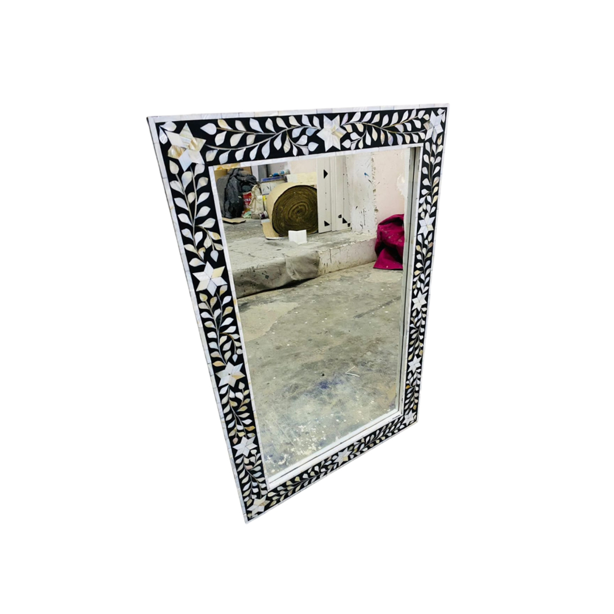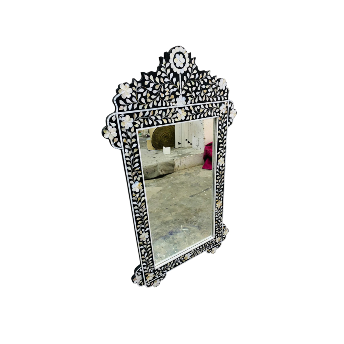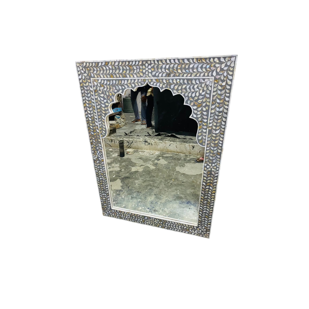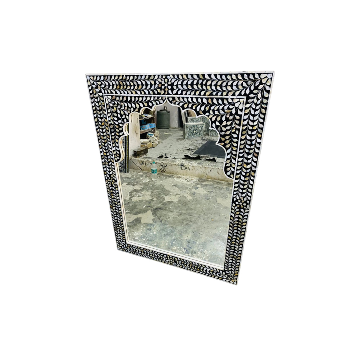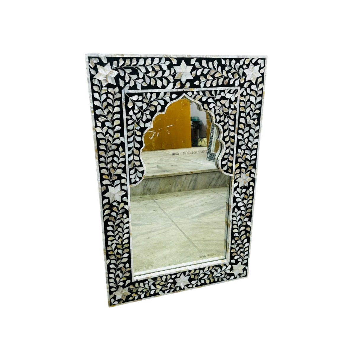 This bold and elegant mirror features a striking black resin background contrasted beautifully with shimmering white mother-of-pearl (or bone) inlay. The inner glass has a unique Mughal-style arched opening, adding depth and architectural interest.