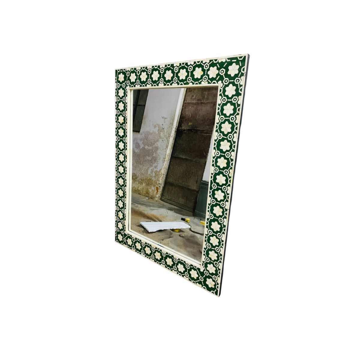 This eye-catching rectangular mirror stands out with its bold use of color—a vibrant emerald green. The frame is decorated with a beautiful, recurring four-petal floral or geometric star pattern created using white, possibly cream-colored, inlaid material. The bright green background gives the traditional inlay design a contemporary and fresh appeal.