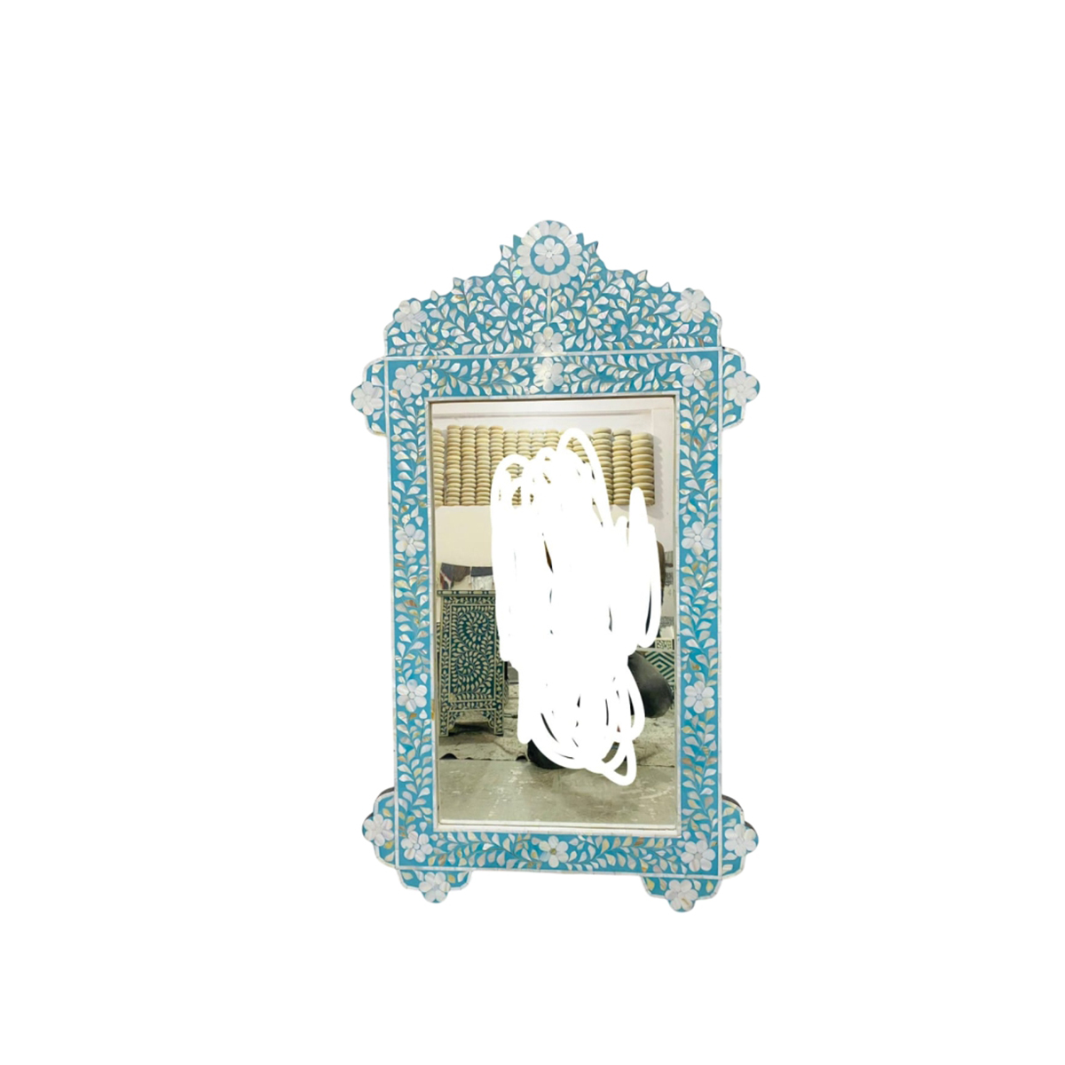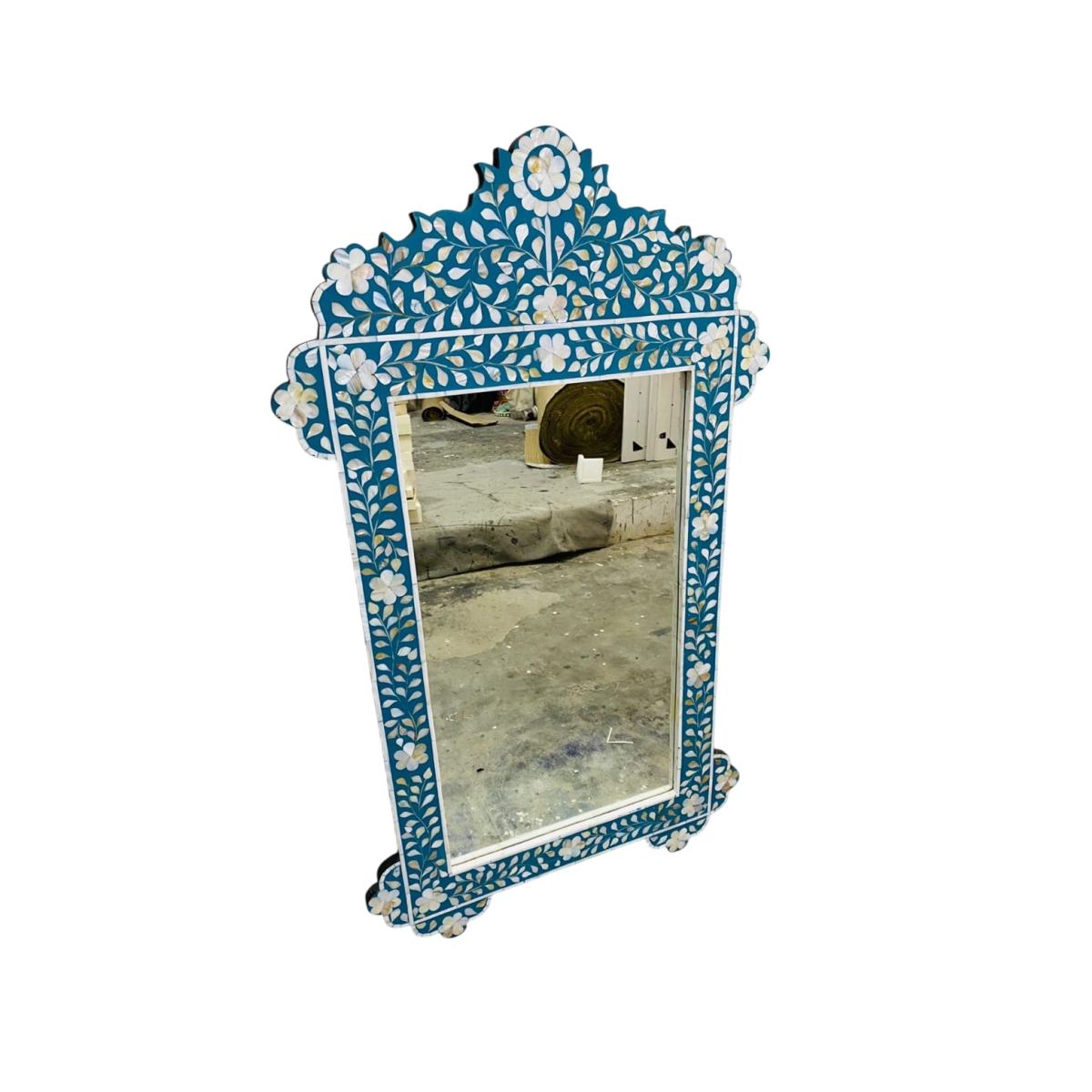 Bring a vibrant pop of color and natural beauty into your home with this Serene Teal Floral Mirror. The striking frame is hand-inlaid with dazzling white Mother of Pearl floral and vine motifs set against a deep, refreshing teal blue resin.