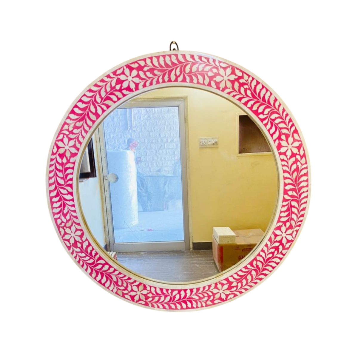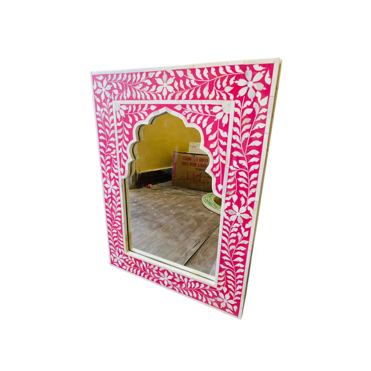 Featuring a bold and fashionable hot pink (fuchsia) base, this mirror is truly a statement piece. The frame is beautifully inlaid with white bone or shell in an all-over floral and leafy vine design. Like some others, it incorporates the appealing Mughal arch shape around the central glass.