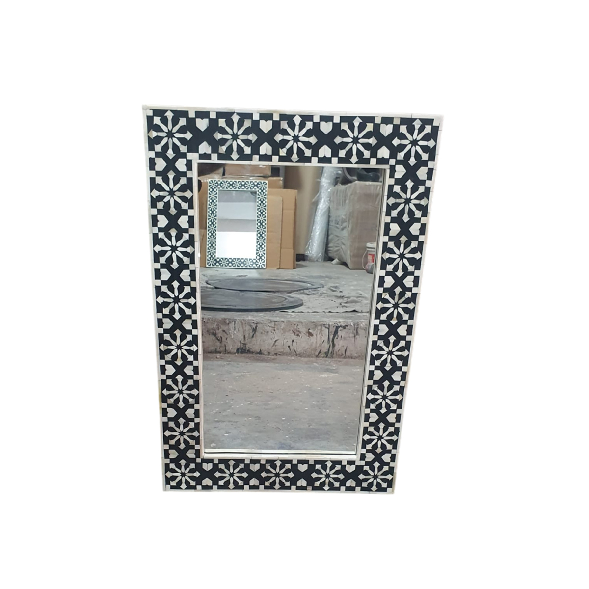 This stunning rectangular wall mirror features a bold, contrasting black and white frame. The frame is intricately embellished with a striking geometric floral pattern created using inlaid pieces, most likely bone or mother of pearl set into a dark resin. The repeating design offers a timeless, sophisticated look that would complement both modern and traditional decor styles. Its clean, rectangular shape makes it a versatile piece suitable for a hallway, living room, or bedroom.