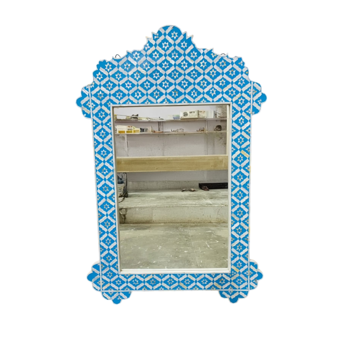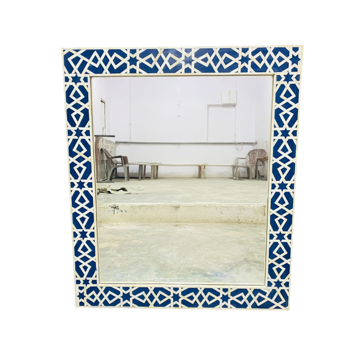 This square mirror boasts a mesmerizing frame adorned with a complex geometric star and trellis pattern in a rich, deep royal blue. The white or off-white inlay creates an interlocking design reminiscent of traditional Islamic or Moroccan art styles. The precision of the repeating motif around all four edges showcases exceptional craftsmanship. The square shape makes it versatile for use in various settings, such as above a console table, as part of a gallery wall, or as a stunning focal point in a modern or eclectic space.