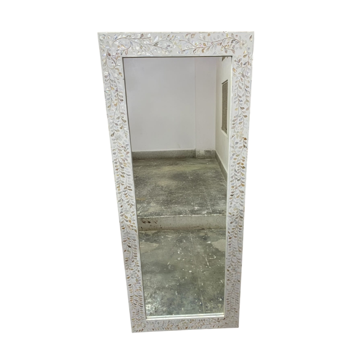 This tall, magnificent mirror provides a full-length view, framed by an exquisite white border inlaid with a graceful vine and leaf pattern. Similar to image_336d7c, the inlay utilizes natural tones, including shimmering white and subtle hints of golden or tan hues, giving the leaves a beautiful, variegated appearance. Its significant height makes it highly functional as a dressing mirror while simultaneously serving as a dramatic piece of decor.