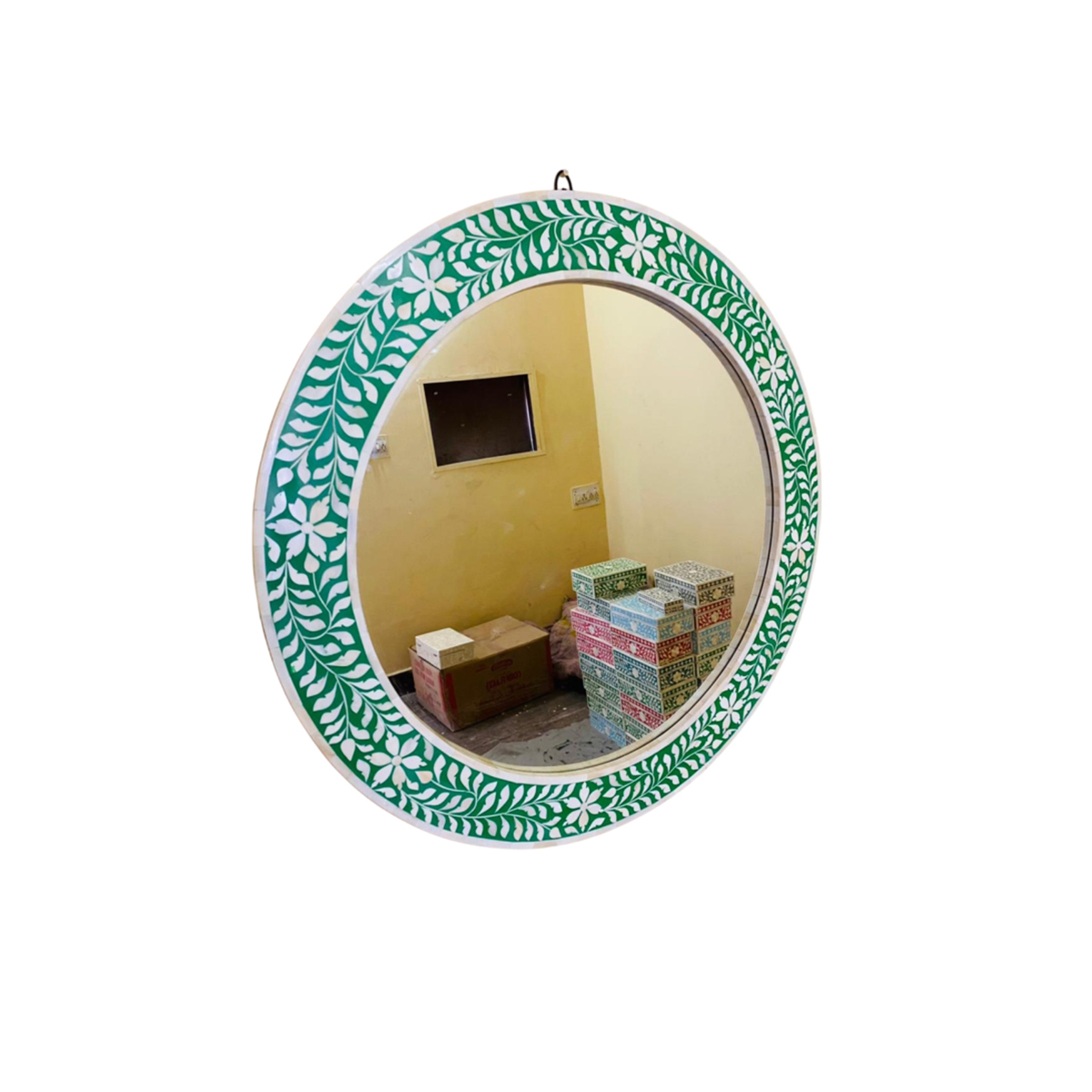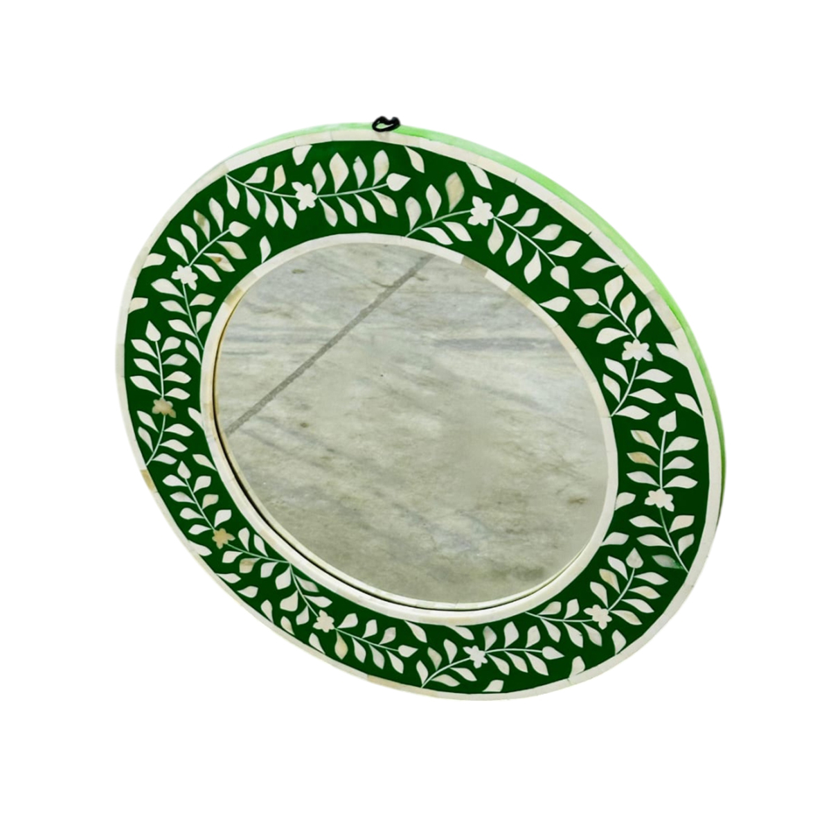 This exquisite oval wall mirror is a stunning example of traditional Indian bone inlay artistry. The mirror features a vibrant, deep emerald green resin background that beautifully contrasts with the intricate natural bone pieces, forming a continuous border of delicate leaves and floral motifs. The meticulous hand-cut and set inlay work showcases the skill of the artisan, adding a layer of sophisticated texture and design.