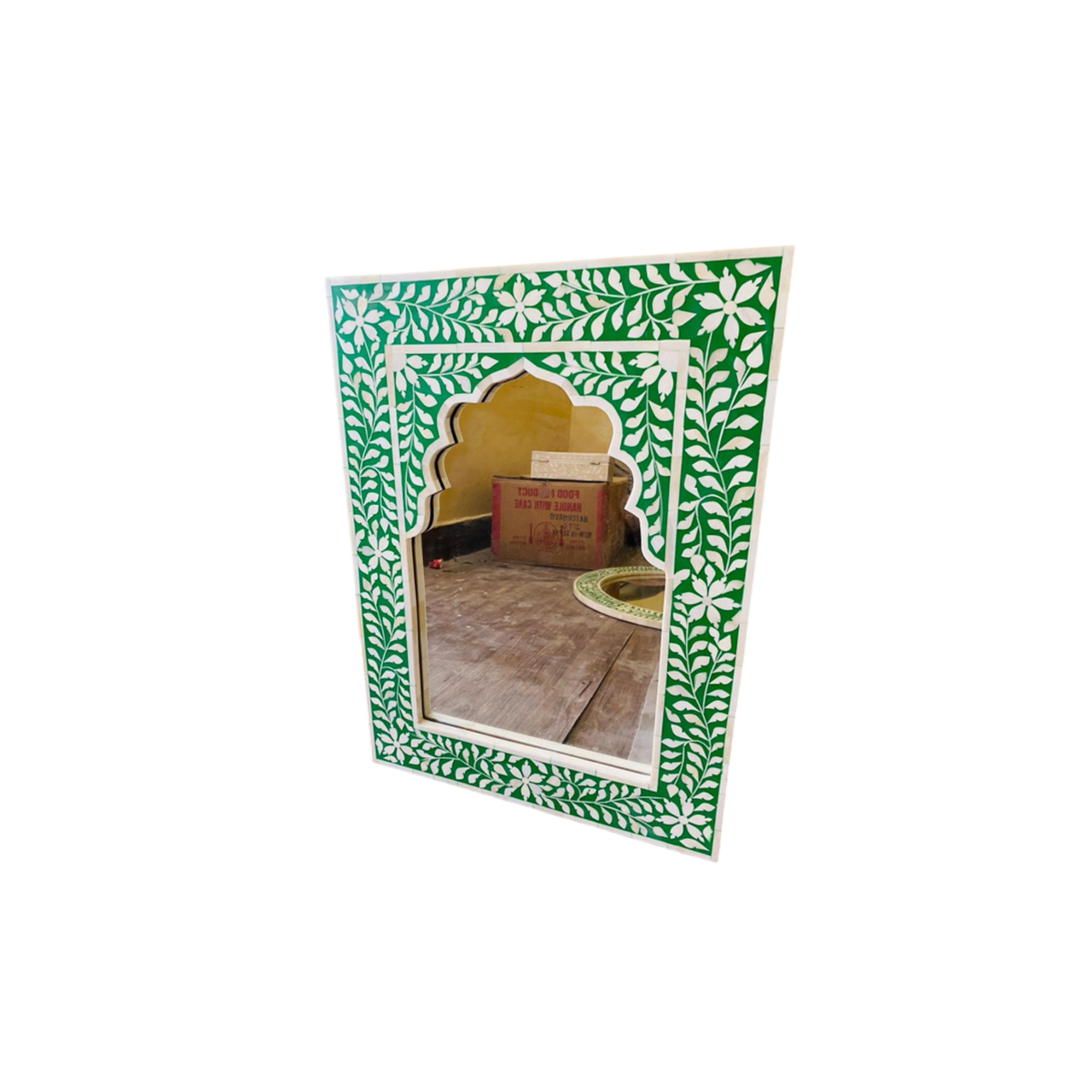 This mirror is a celebration of color and design, featuring a lively green resin background inlaid with crisp white bone or shell pieces. The mirror glass is surrounded by an inner Mughal-inspired ogee arch, a beautiful architectural detail.