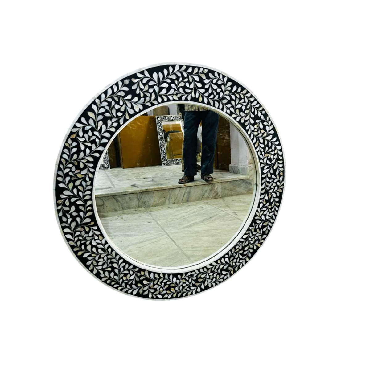 This stunning circular mirror features a wide, ornate frame meticulously inlaid with natural materials, likely mother-of-pearl or bone, set against a deep black background. The design showcases a continuous vine and leaf motif, creating an elegant, organic border around the glass.