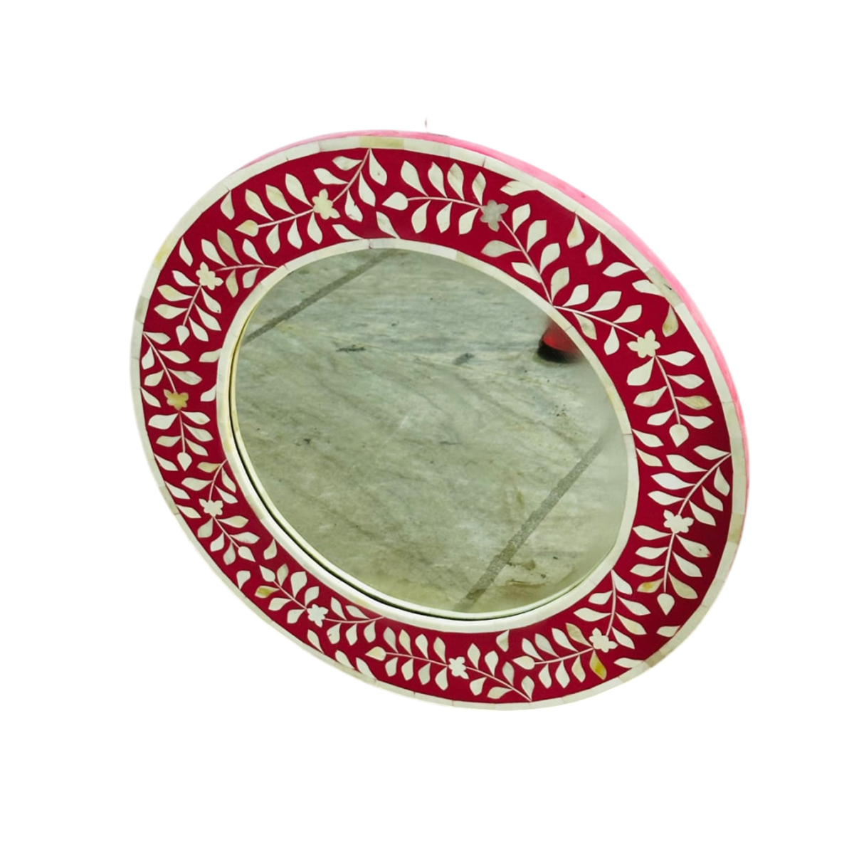 Elevate your home décor with this striking oval decorative mirror, meticulously crafted using the time-honored technique of bone inlay. The bold maroon or ruby red resin color provides a dramatic and rich backdrop for the hand-inlaid bone pieces. These pieces are intricately arranged to create a graceful vine and floral border that encircles the reflective glass. The vibrant red and the creamy white of the natural bone create a compelling color contrast that is both eye-catching and luxurious.