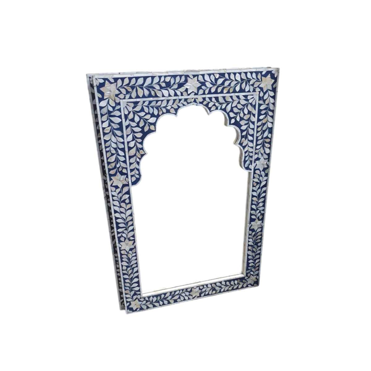 Unlike the others, this item is a rectangular mirror. It features a rich indigo/navy blue background beautifully inlaid with a delicate, continuous vine and leaf pattern. The corners of the frame are accented with distinct white star motifs, giving the piece a classic yet slightly whimsical look. The meticulous hand-inlay work showcases a high level of artisanal skill, making this mirror a substantial and decorative piece in its own right.