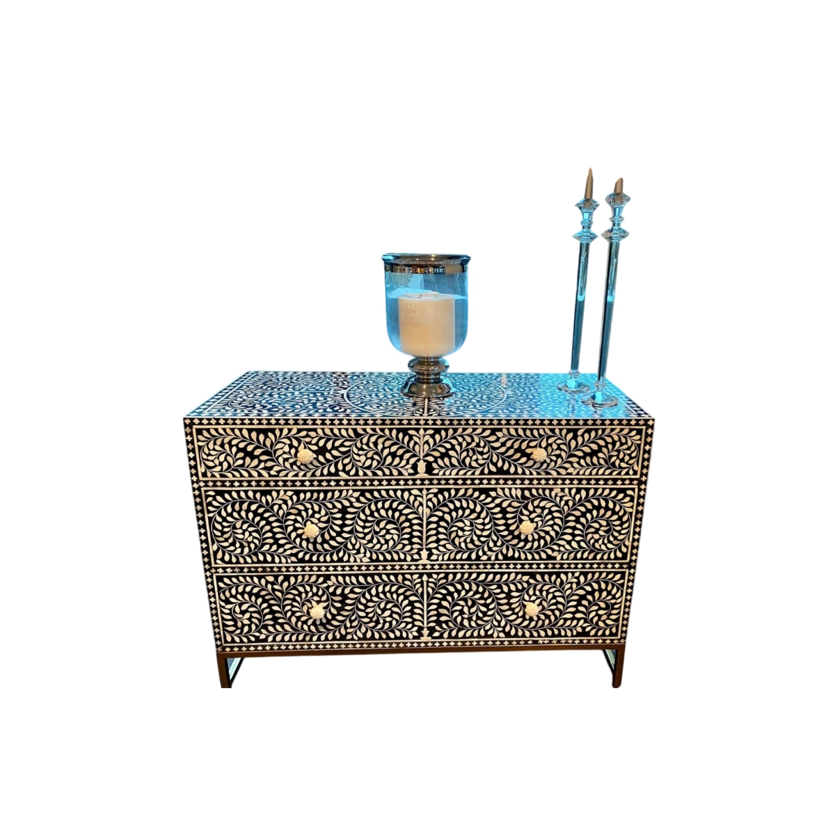 This substantial nine-drawer console or dresser is a masterful example of black and white bone inlay furniture. Its facade is dominated by a complex, repetitive star or floral geometric pattern reminiscent of traditional Moroccan or Indian lattice work, executed entirely in dazzling white inlay on a black resin background. The cabinet is divided into three vertical sections, each featuring a column of three drawers, framed by elegant border patterns. The overall effect is one of dramatic texture and visual depth, ensuring it commands attention in any room. Its rectangular top also boasts the same intricate inlay pattern. Resting on beautifully carved and inlayed curved legs, this large storage piece provides ample space for clothing, linens, or media, combining massive utility with breathtaking decorative art. The density of the pattern and the symmetrical layout lend it a distinctly regal and grand presence.