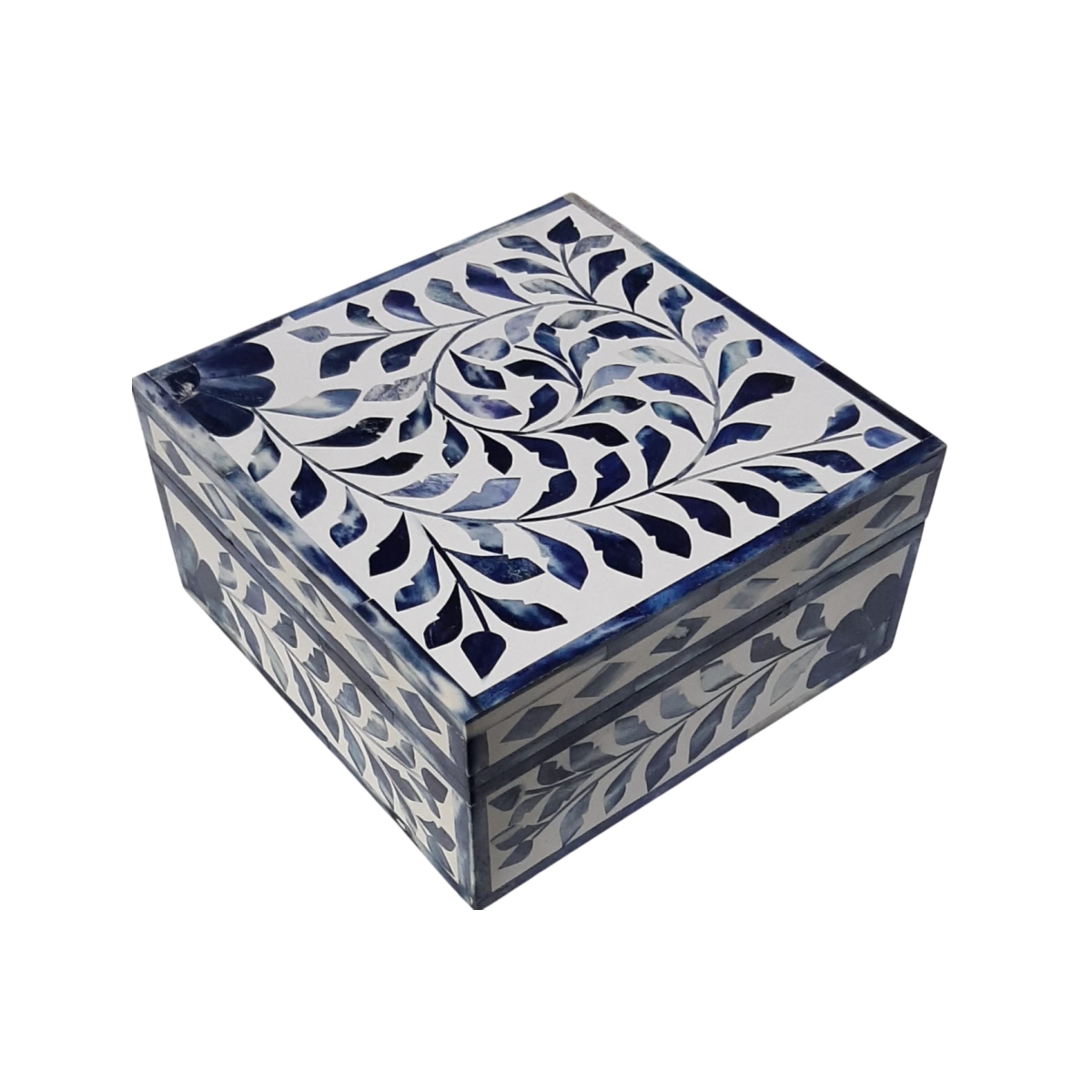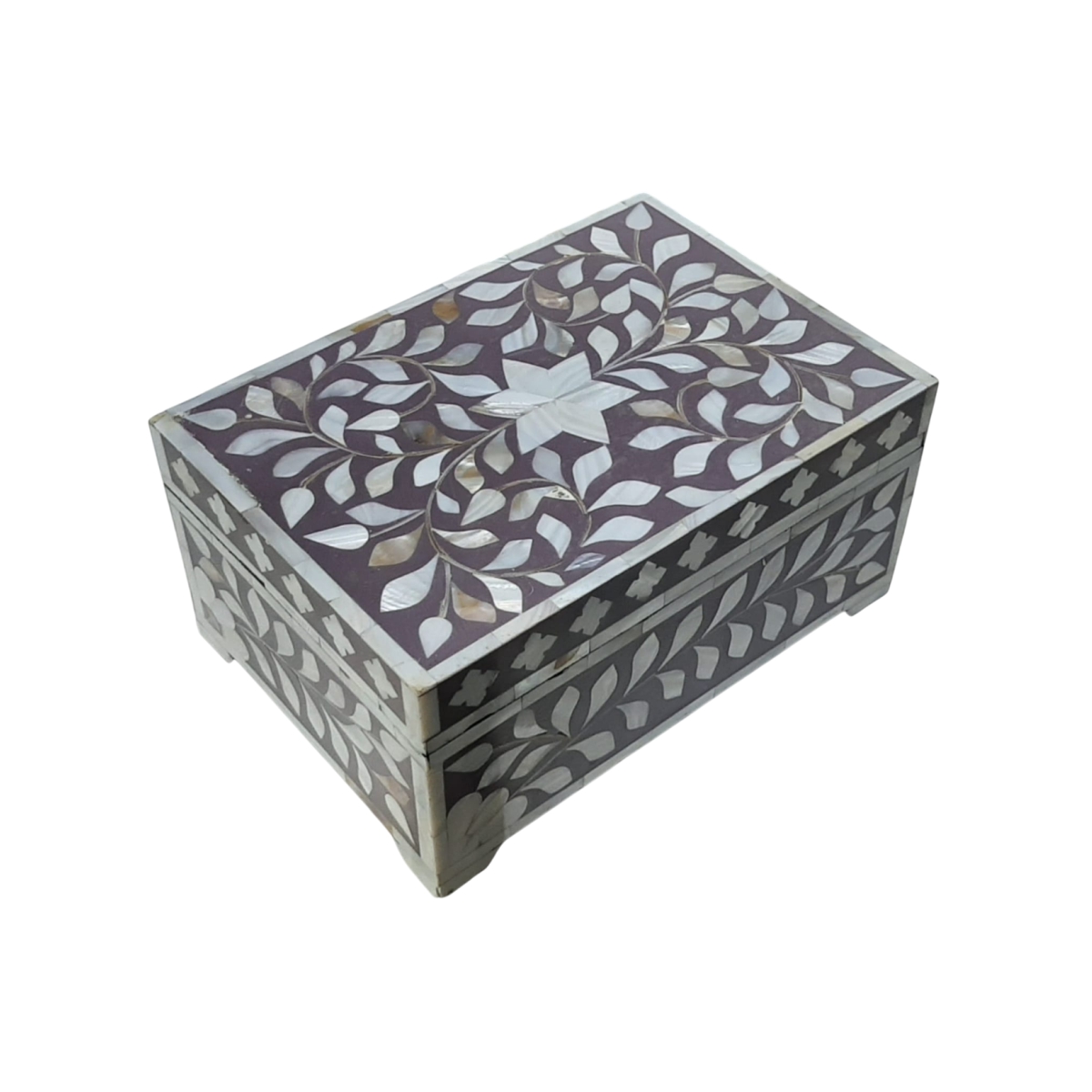 Similar in form to the first box, this rectangular piece distinguishes itself with its construction and added corner details. The lid boasts a symmetrical design featuring a large central flower motif surrounded by a border of intricate scrolling vines and blossoms. The sides are covered in complex, high-relief carving. A key feature is the decorative treatment of the corners: the box appears to be crafted from segmented, fitted pieces, and the corners are accented with small, contrasting square inlays or decorative studs, giving it a more finished, complex construction look. The material’s hue emphasizes the depth of the carving, making the floral and geometric patterns stand out. It is a stunning, highly textural box perfect for sophisticated storage or display.
