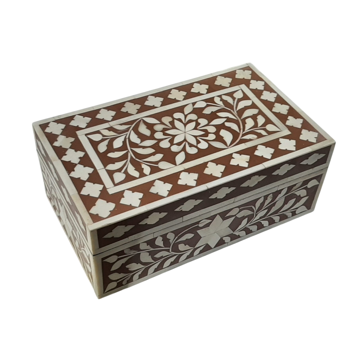 A stunning example of meticulous craftsmanship, this square box is deeply and intricately hand-carved with elaborate floral and foliage patterns. The rich, earthy-toned material highlights the three-dimensional texture of the carving. The lid features a prominent central rosette design surrounded by layers of decorative borders, including a feather-like fringe. This heavy, detailed box serves as an opulent decorative piece and a secure, beautiful place for precious mementos or small valuables. Its traditional styling brings an air of antiquity and sophistication.